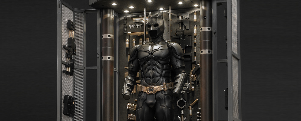 『ダークナイト』に登場するバットスーツ格納庫を、全高約37cm、幅約23cm、奥行き約14cmの迫力あふれる1/6スケールで立体化。扉を開くと幅約31cmまで広がり、開閉することで2通りのディスプレイを楽しむことが可能だ。無機質な金属の質感など、細部に至るまで精密に再現し、重厚感あふれる仕上がり。豊富に付属している、バットマンならではの武器やアクセサリー類は、可動する扉や棚に収納できるぞ。本体内部には随所にLEDを配置。リモコンによるON/OFF機能が付いているので、気軽にライトアップ機能を楽しめる。また、全高約31cm、30箇所以上が可動する、バットマンのフィギュアが付属。バットスーツとして格納することが可能だ。マスクは2種が付いており、1つ目は格納時に使用する空のマスク。2つ目は新規開発となる、マスクを被ったバットマンのヘッドだ。バットマンのヘッドは眼球可動ギミックを搭載し、自由な視線変更によって、まるで生きているかのような存在感を醸し出すことが可能。さらに、フィギュアに本セットのブルース・ウェインのヘッドと付属の襟を取り付け、マスクを脱いだ姿にすることもできるぞ!新たにデザインされたバットスーツは、より劇中に忠実にアップデート。布を使用したマント、メタリックゴールドのユーティリティ・ベルトなど、質感やディテールにこだわり精巧に再現している。多彩な差し替え用ハンドパーツと武器やアクセサリーを組み合わせることで、さまざまな劇中シーンを演出可能だ。