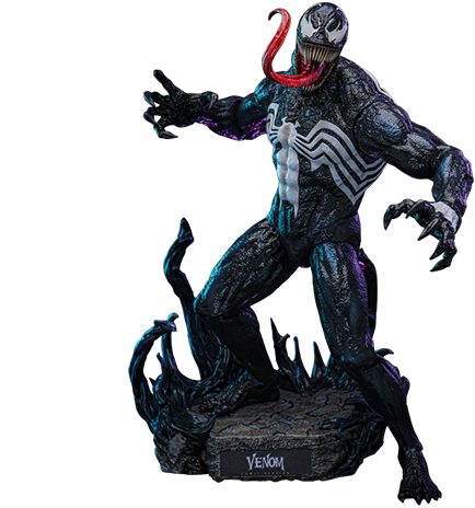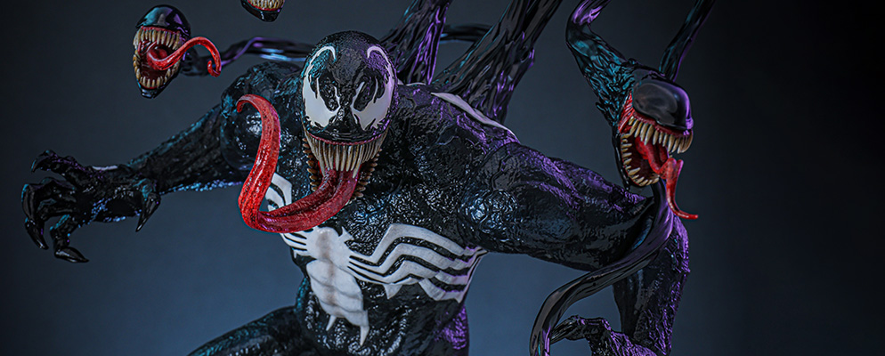 『マーベル・コミック』に登場するヴェノムを、大迫力の全高約39cm、20箇所以上が可動するハイエンドな1/6スケールのフィギュアとして立体化。新規塗装となるヘッドは2種が付属。1つ目は、大きく口を開け舌を出したヘッド。2つ目は、ニヤリと笑うヘッドだ。舌を出したヘッドは、付属する2種の舌パーツと差し替えることで、3通りのディスプレイができる。マッシブな黒いボディは、胸と背中の大きな白い蜘蛛のマークなど、ディテールや素材にこだわり抜き、細部まで精巧な仕上がり。業界トップクラスの塗装技術によって、シンビオート特有のぬめっとした質感を表現している。新たにデザインされた、ミニ・ヴェノムの顔がついた3つのシンビオートの触手は、背中に取り付け可能。内蔵ワイヤーによって動きをつけることができるぞ。差し替え用足パーツや、差し替え用ハンドパーツを使用すれば、さまざまなシチュエーションを演出可能だ。台座は、シンビオートが造形されたジオラマ仕様となっている。