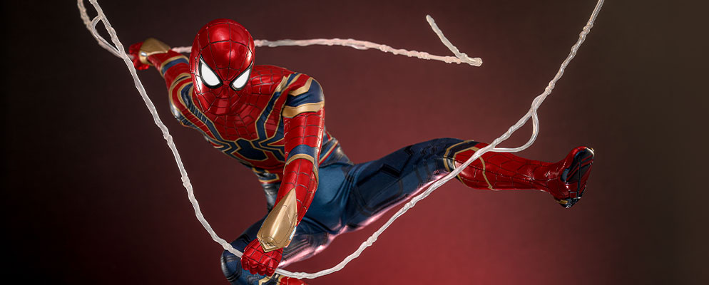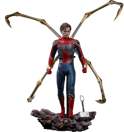 アイアン・スパイダーは、トニー・スタークがナノテクを用いて開発したスーツを着用したスパイダーマンだ。メタリックカラーのデザインと、背中から生えた4本のピンサーを特徴としている。サノスの指パッチンによる5年の間消滅から舞い戻ったピーター・パーカー(スパイダーマン)は、"スリング・リング"のゲートウェイを通じてアベンジャーズVSサノスの最終決戦に参戦する。再びインフィニティ・ストーンを取り戻そうとするサノスとガントレットの争奪戦になる中、スパイダーマンはガントレットを片手に戦場をスイングするのであった。
